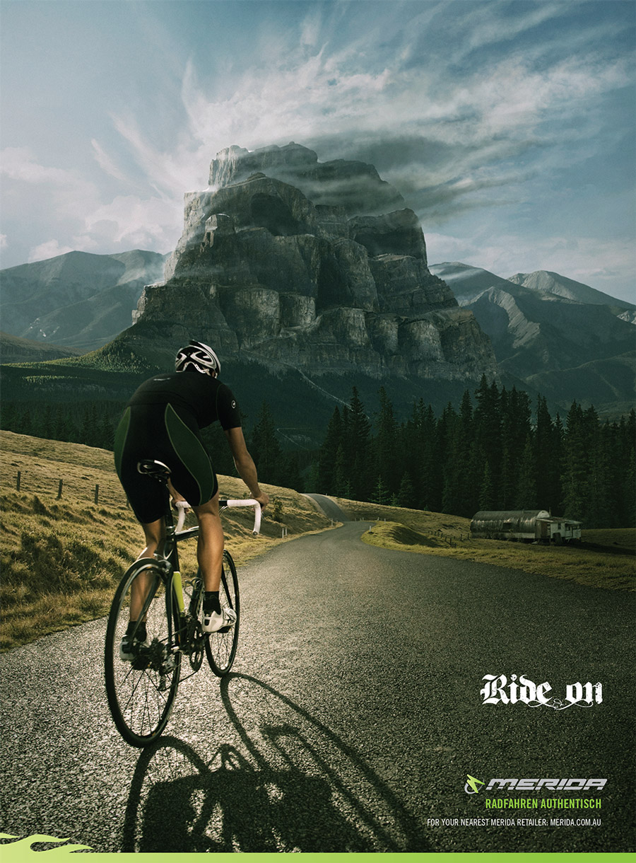 As a solution a set of images where created showing a bike rider traveling towards what looks like extremely dangerous events such as a demonic sand storm or a skull faced mountain climb. Each image is tagged with the line 'Ride On'.