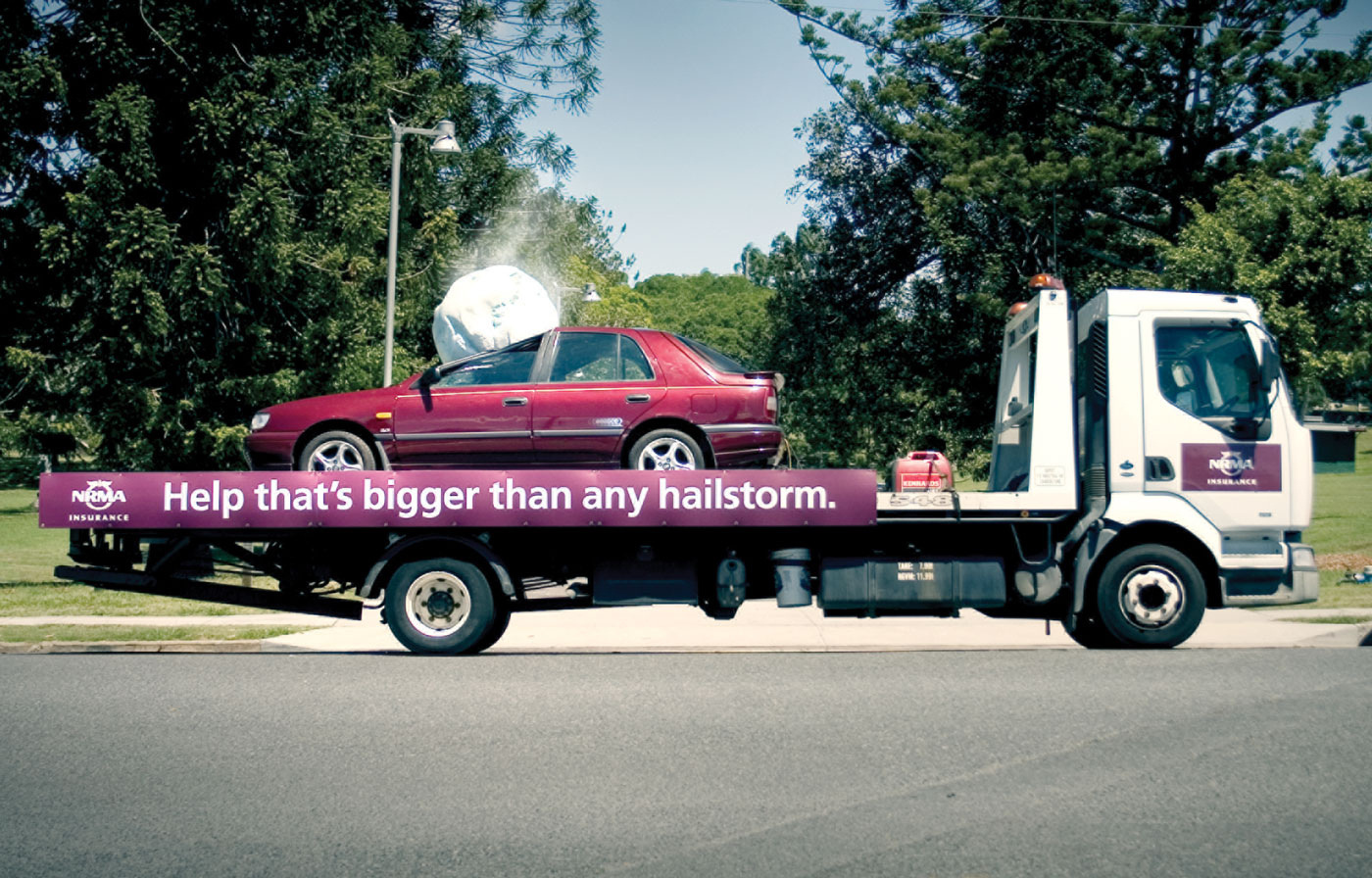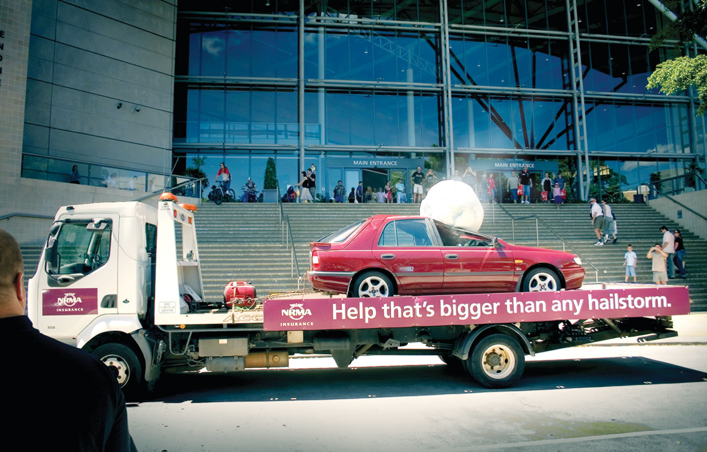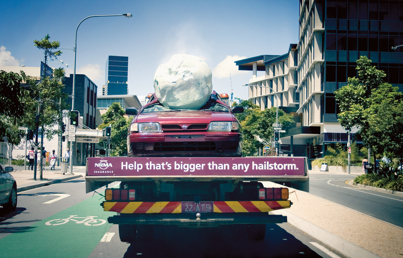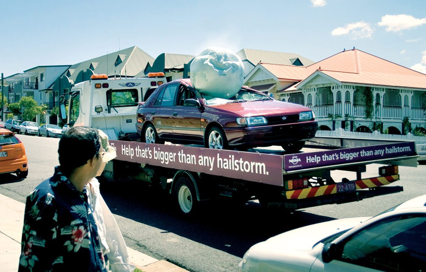 So instead of running traditional ads in the Courier-Mail a giant hailstone was created which was placed on top of a damaged car and loaded unto a removal truck. A message was then printed on the side of the truck which read 'Help that's bigger than any hailsone.' Inside the Hailstone steam was released through small vents on top of the structure to create the effect of melting ice. The truck was then taken to various parts of South East Queensland including Brisbane, The Gold Coast and The Sunshine Coast.