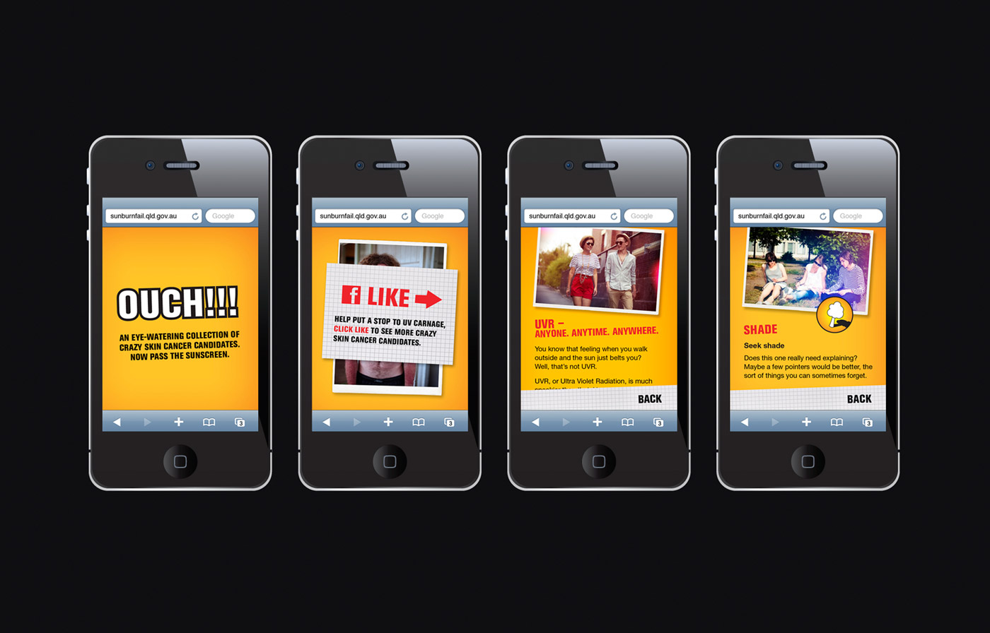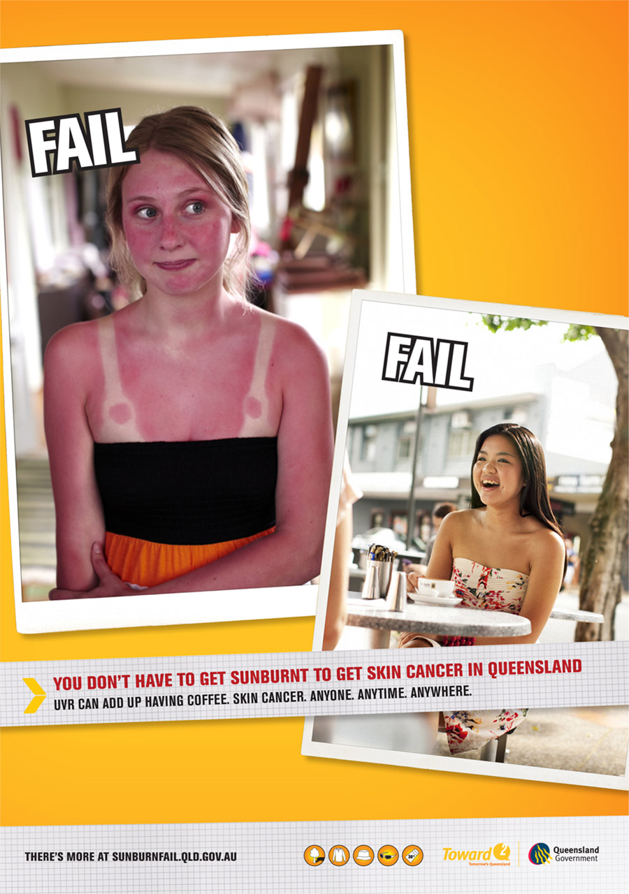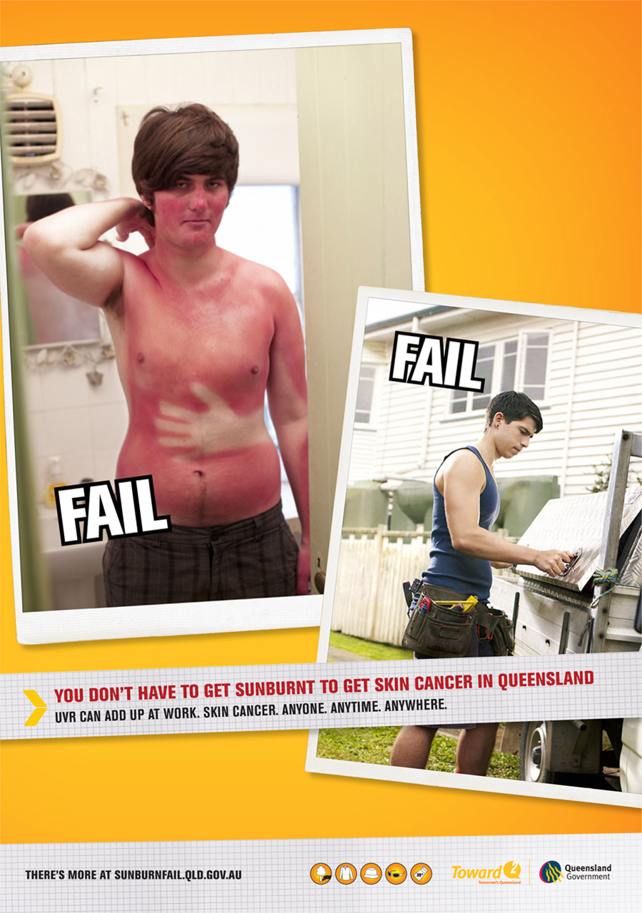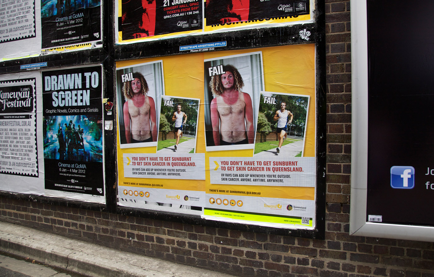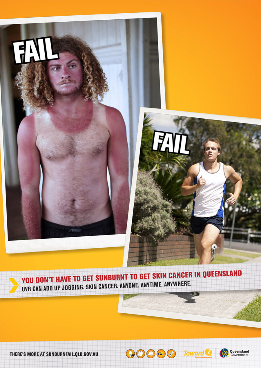 The idea was to show a set of badly sunburnt individuals of different ages looking a little miserable or embarrassed and slap a 'Fail' badge over the image. At the same time we show images of a non-sunburnt people in the act of running, at a café or working and apply the same 'Fail' badge indicating you don't need to get sunburnt to get skin cancer.
