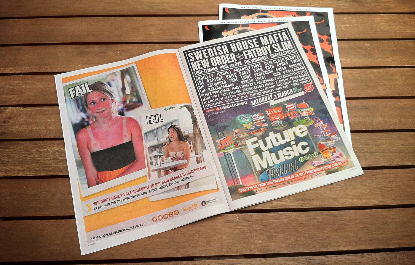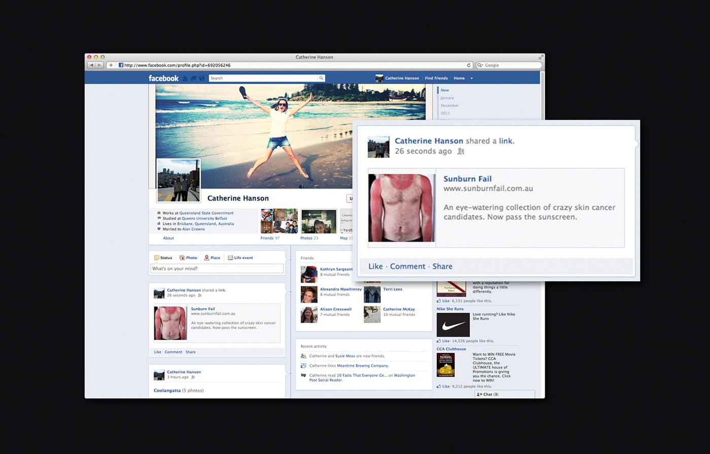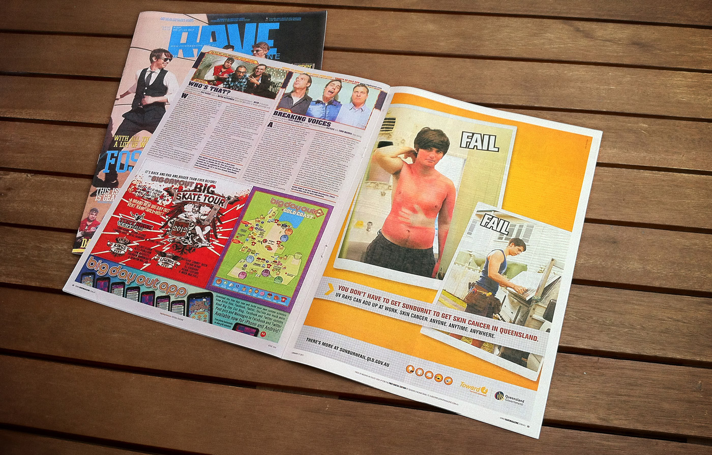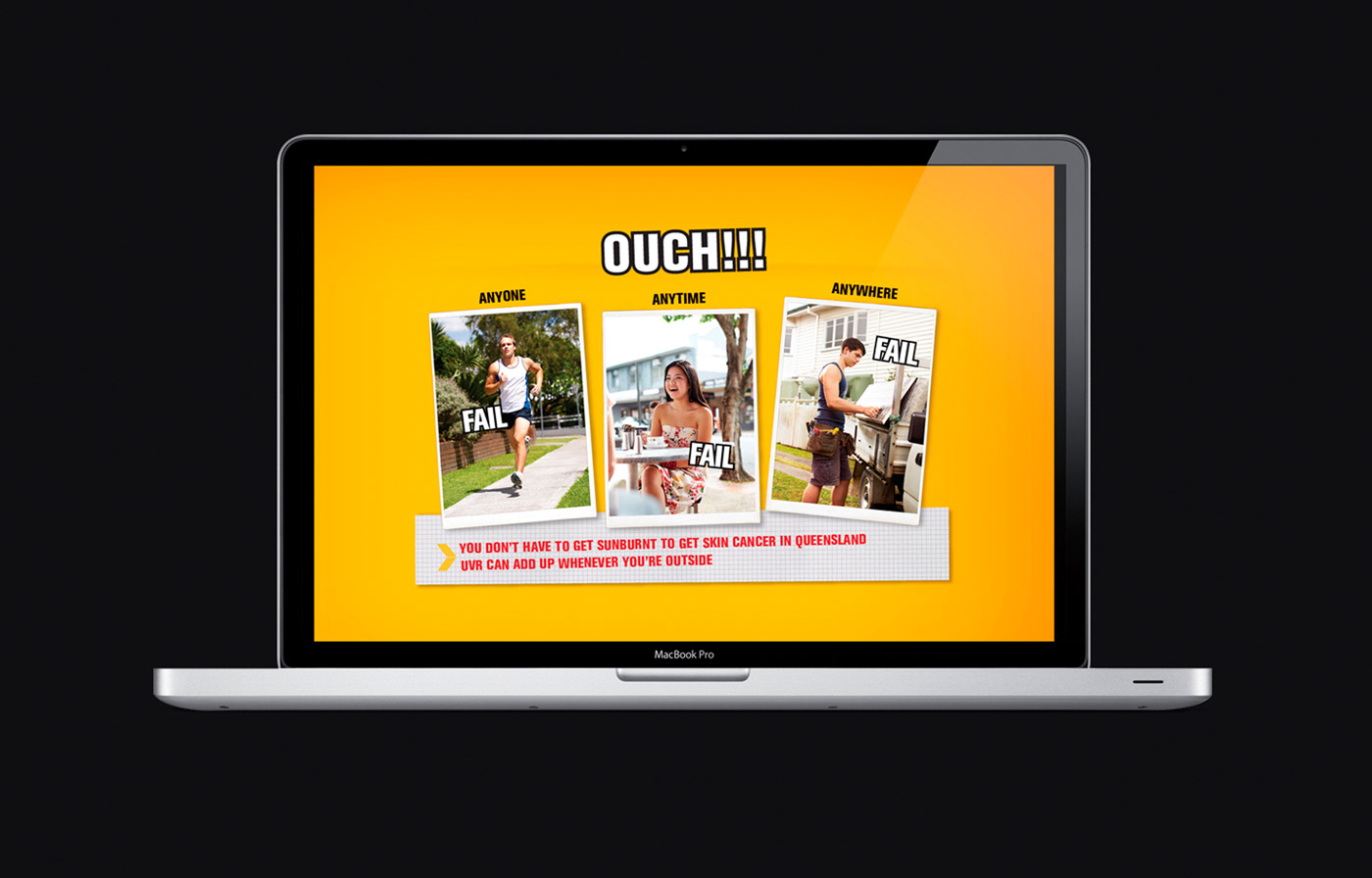 The idea was to show a set of badly sunburnt individuals of different ages looking a little miserable or embarrassed and slap a 'Fail' badge over the image. At the same time we show images of a non-sunburnt people in the act of running, at a café or working and apply the same 'Fail' badge indicating you don't need to get sunburnt to get skin cancer.